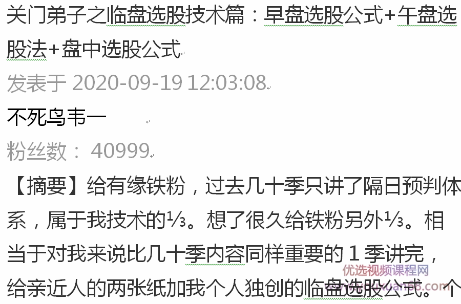 不死鸟韦一9.19关门弟子之临盘选股技术篇:早盘选股公式+午盘选股法+盘中选股公式——更多资源,课程更新在 优选视频教程资源整合网www.youxuan68.com